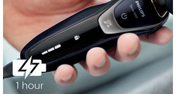 Czas ładowania: 1 godz. Dłuższe golenie po każdym ładowaniu dzięki wydajnemu, efektywnemu i trwałemu akumulatorowi litowo-jonowemu. Szybkie ładowanie przez 5 minut zapewnia wystarczającą ilość energii na jeden cykl golenia. |