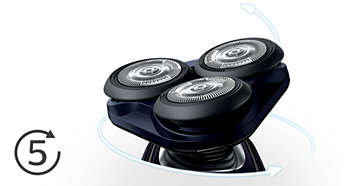Głowice poruszają się w 5 kierunkach, zapewniając szybkie i dokładne golenie 5-kierunkowe głowice o 5 niezależnych ruchach gwarantują bliski kontakt ze skórą w celu zapewnienia szybkiego i dokładnego golenia nawet na linii szyi i szczęki. |