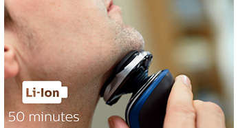 | Do 50 minut bezprzewodowego golenia Uzyskasz około 50 minut czasu pracy — około 17 cykli golenia — po godzinie ładowania. Golarka pracuje tylko w trybie bezprzewodowym. |