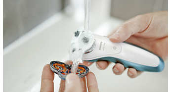 | Golarkę można płukać pod bieżącą wodą Wystarczy otworzyć głowicę golarki, aby dokładnie wypłukać ją pod bieżącą wodą. |