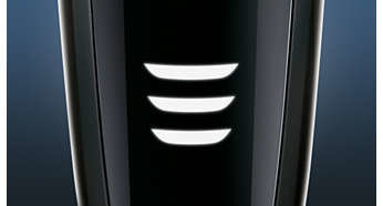 Intuicyjne ikony ułatwiają korzystanie z funkcji Intuicyjny wyświetlacz pokazuje ważne informacje i pozwala w pełni wykorzystać potencjał golarki: - 3-poziomowy wskaźnik naładowania akumulatora i wskaźnik blokady podróżnej - Wskaźnik konieczności czyszczenia - Wskaźnik niskiego poziomu naładowania akumulatora - Wskaźnik wymiany głowic. |
