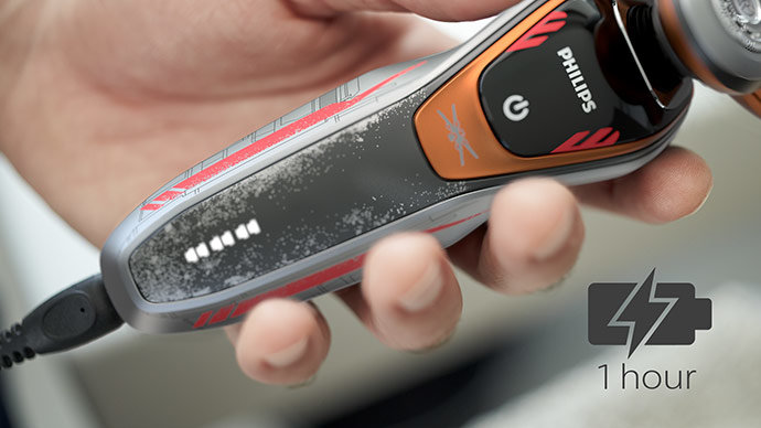 Uzyskasz ponad 60 minut czasu pracy — około 20 cykli golenia — po godzinie ładowania. Golarka pracuje tylko w trybie bezprzewodowym.