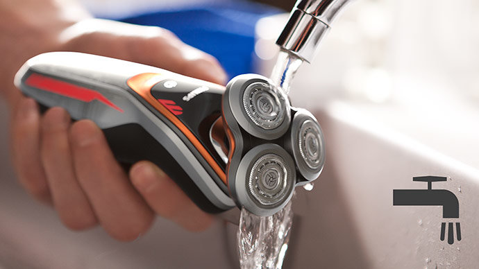 Wystarczy otworzyć głowicę golarki, aby dokładnie wypłukać ją pod bieżącą wodą.