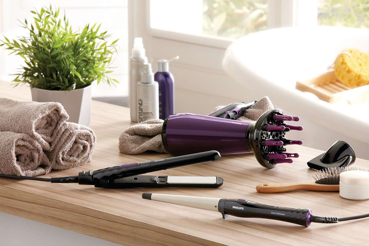Lepsza pielęgnacja jonowa zapewnia proste i lśniące włosy Zadbaj o swoje włosy dzięki pielęgnacji jonowej. Naładowane ujemnie jony zapobiegają elektryzowaniu się, poprawiają stan włosów i wygładzają łuski włosów, dodając blasku i połysku. W rezultacie włosy stają się cudownie lśniące, gładkie i proste. |