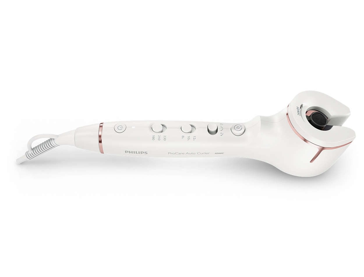 Łatwe tworzenie loków — nawet z tyłu Automatyczna lokówka Philips ProCare ma ergonomiczną i czułą konstrukcję, która ułatwia tworzenie i układanie loków, nawet z tyłu głowy. |