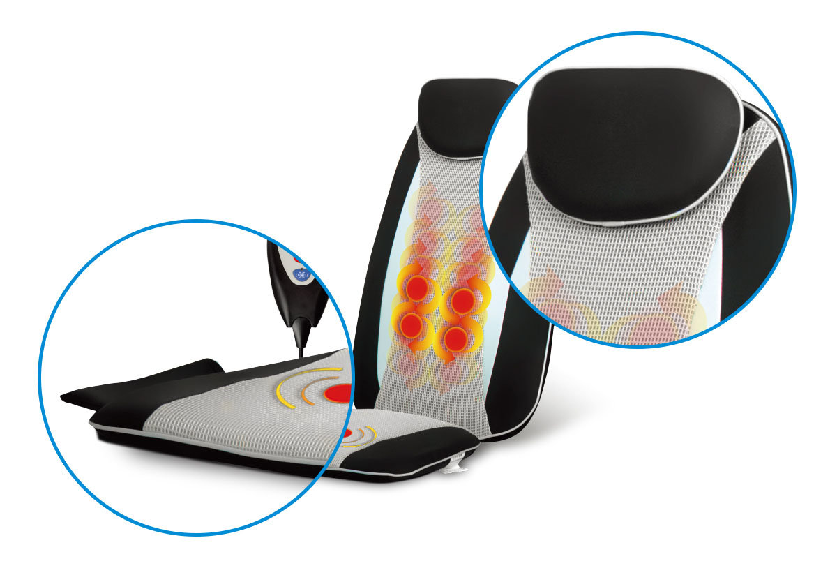 Całość sterowana jest za pomocą bardzo przejrzystego i czytelnego pilota. Łatwy montaż, za pomocą elastycznych zacisków - nawet na domowych krzesłach czy fotelach. Masażer ma łatwy do czyszczenia materiał.