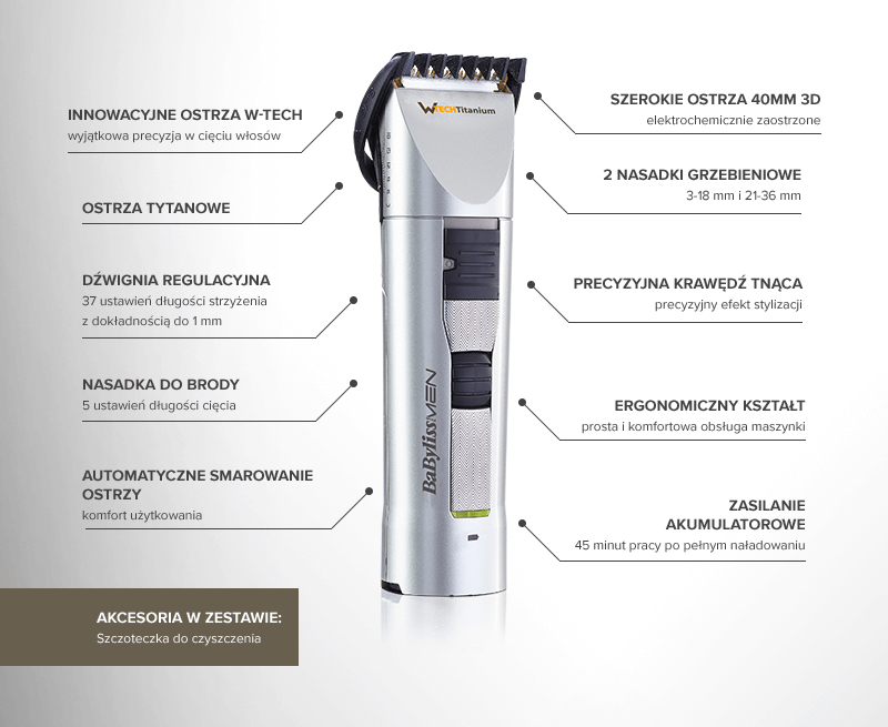 | Funkcje dodatkowe: | Blokada ustawień strzyżenia, Regulacja długości cięcia, Technologia W-TECH |