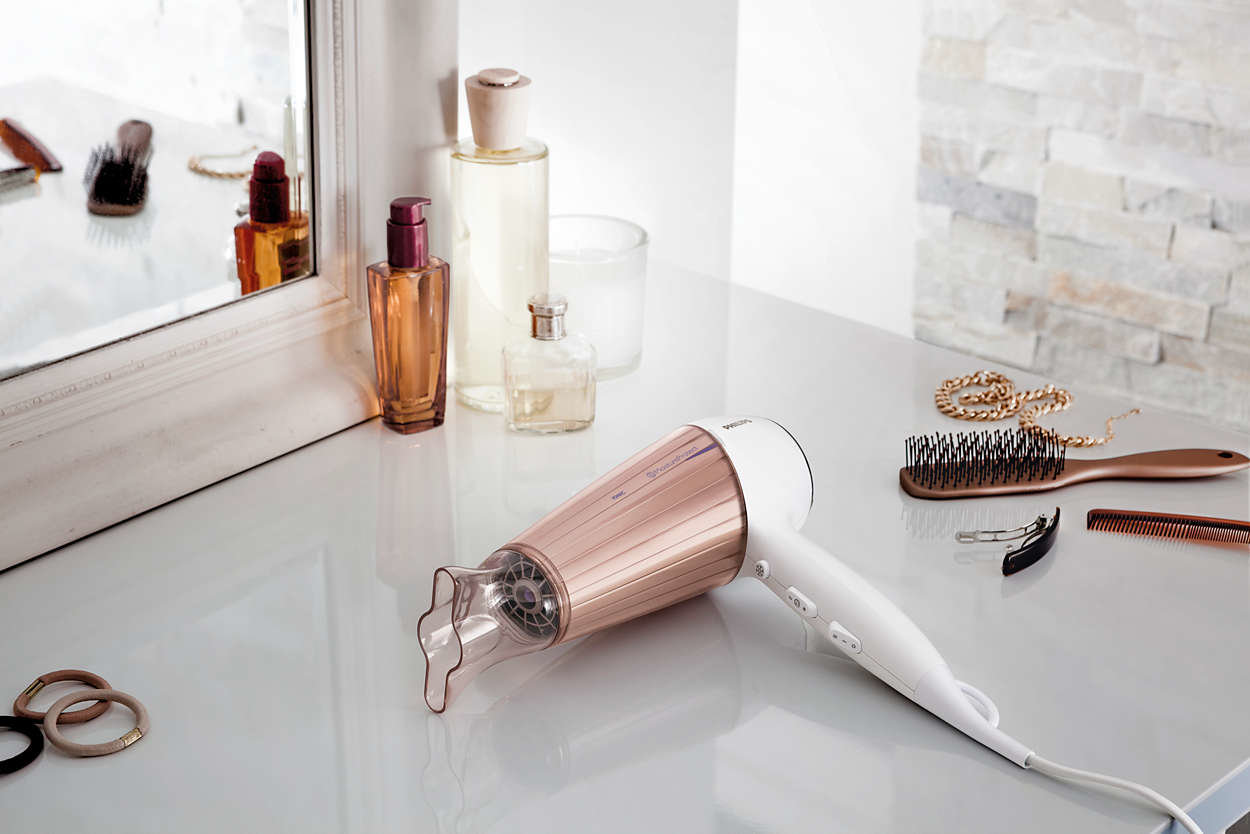 | Zachowaj naturalne nawilżenie włosów Zdrowe, lśniące włosy -Czujnik MoistureProtect -2300 W -ThermoProtect i pielęgnacja jonowa -Dyfuzor zwiększający objętość włosów |