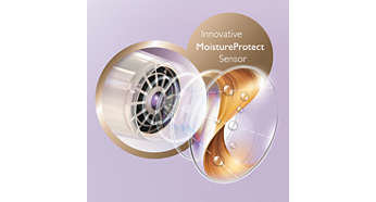 | Doskonała kontrola temperatury dzięki innowacyjnemu czujnikowi Czujnik MoistureProtect Sensor mierzy temperaturę włosów i automatycznie zatrzymuje nagrzewanie, kiedy włosy są suche, chroniąc włosy przed przegrzewaniem. |