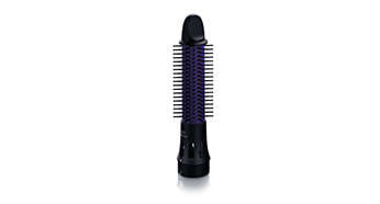 | Szczotka z wysuwanymi ząbkami zapewnia łatwe podkręcanie włosów Ta prosta w obsłudze suszarko-lokówka łączy w sobie szczotkę do modelowania i lokówkę. Ząbki wsuwają się do wnętrza szczotki po naciśnięciu jednego przycisku, można więc z łatwością wysunąć lokówkę z włosów. Rezultat to piękne, sprężyste loki. |