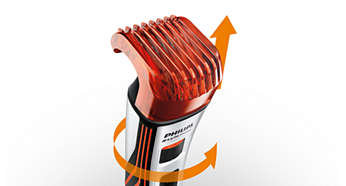 | Łatwe do wybrania i zablokowania ustawienia długości Kółko ustawień długości umożliwia łatwe blokowanie nasadki grzebieniowej w jednym z 12 ustawień. W przypadku krótszych włosów ustawienia zmieniają się co 0,5 mm, gwarantując ogromną precyzję i możliwość uzyskania efektu popołudniowego lub kilkudniowego zarostu. W przypadku dłuższej brody ustawienia można zmieniać co 1 mm, aby przyciąć ją na żądaną długość. |