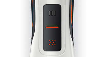 Pokazuje stan akumulatora Wskaźnik świeci światłem ciągłym, gdy akumulator jest w pełni naładowany, a miga na pomarańczowo, gdy z urządzenia można korzystać jeszcze przez około 10 minut. |