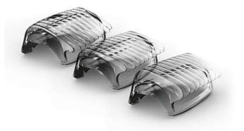 W zestawie 3 nasadki grzebieniowe do przycinania do długości 3, 5 i 7 mm 3 nasadki grzebieniowe do włosów na ciele o różnej długości. Aby przyciąć włosy do długości 3, 5 lub 7 mm, należy zamocować nasadkę na golarce. Golarkę można stosować bez nasadki, aby uzyskać dokładniejsze golenie. W przypadku grubszych włosów zaleca się przycinanie wstępne z użyciem nasadki grzebieniowej. |