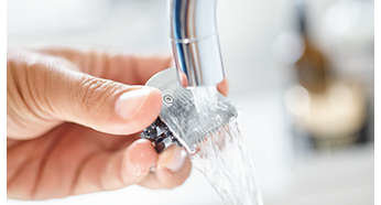 | Wystarczy opróżnić komorę i spłukać ostrza wodą Aby zagwarantować długotrwałą skuteczność urządzenia, po zakończeniu przycinania wystarczy spłukać ostrza i nasadkę pod bieżącą wodą, opróżnić komorę na włosy i wymieść pozostałe włosy dołączoną szczoteczką do czyszczenia. |