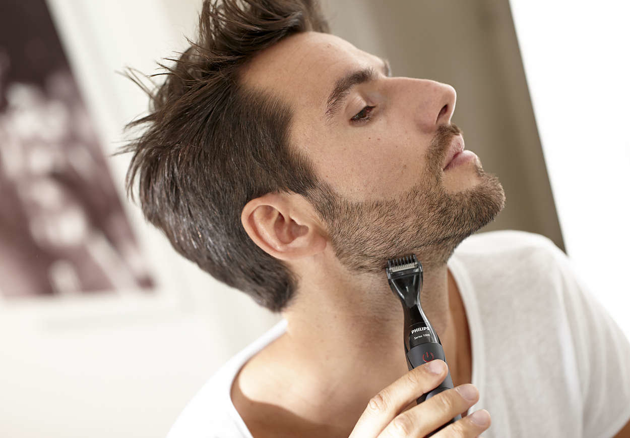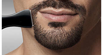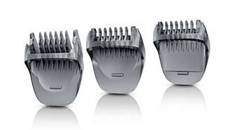 | 3 precyzyjne nasadki do równego przycinania zarostu Przy użyciu precyzyjnych, nakładanych nasadek (1, 3 i 5 mm) możesz przyciąć i wyrównać kilkudniowy zarost, brodę, kozią bródkę, bokobrody lub wąsy. |
