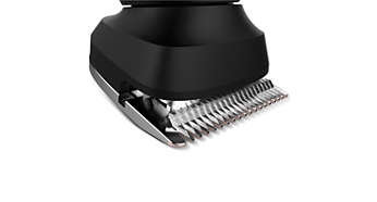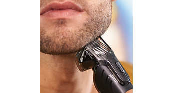 | 18 ustawień długości (1–18 mm) pozwalających równo przyciąć brodę lub zarost Można zablokować odpowiednie ustawienie, aby uzyskać żądaną długość zarostu. Nasadka grzebieniowa do brody i zarostu zapewnia 18 ustawień długości w zakresie od 1 do 18 mm, a odstęp pomiędzy kolejnymi ustawieniami wynosi dokładnie 1 mm. |