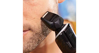 | Precyzyjne golenie małych obszarów na policzkach i podbródku Pozbądź się niechcianych włosów z małych obszarów na policzkach i podbródku, aby schludnie wykończyć stylizację zarostu. |