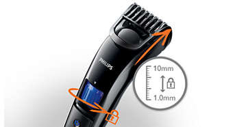 | Łatwy wybór i blokowanie ustawień długości: 1–10 mm Obróć kółko, aby w prosty sposób wybrać i zablokować żądane ustawienia długości: od krótkiego zarostu o długości 1 mm do pełnej brody o długości 10 mm. Odstęp między ustawieniami wynosi 1 mm. |