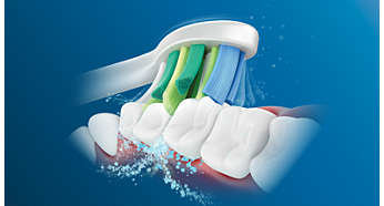 Rączka i główka Sonicare to doskonałe połączenie. Wynoszą naszą technologię soniczną na nowy poziom i zapewniają niezrównaną skuteczność czyszczenia. Szybkie wibracje rączki powodują do 62 tys. ruchów szczoteczki na minutę, które przekształcają mieszaninę pasty do zębów i śliny w delikatne mikrobąbelki, a następnie kierują je głęboko między zęby i wzdłuż linii dziąseł, aby szczotkowanie było wyjątkowo skuteczne.