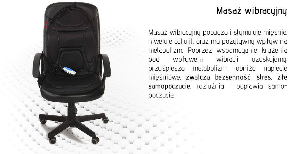 Masaż wibracyjny wprowadza całe ciało w miarowe drgania, które pobudzają krążenie krwi, poprawiając tym samym ukrwienie całego organizmu. Dodatkowa funkcja podgrzewania wzmaga poczucie komfortu i relaksu. Jest ono szczególnie korzystne dla napięcia mięśni - rozluźnia całe ciało i działa kojąco, wspomaga działanie masażu. Dzięki ergonomicznemu kształtu i wykonania z elastycznych materiałów dopasowuje się do każdego fotela. Bardzo popularna w samochodach ze skórzaną tapicerką, odporna na ścieranie. Polecana dla kierowców wyjeżdżających w długie trasy, dzięki macie unikniesz drętwienia nóg czy bólu pleców. Mata jest ultra cienka, dzięki czemu nie musisz zmieniać położenia fotela w samochodzie. Zasilanie samochodowe z zapalniczki. |