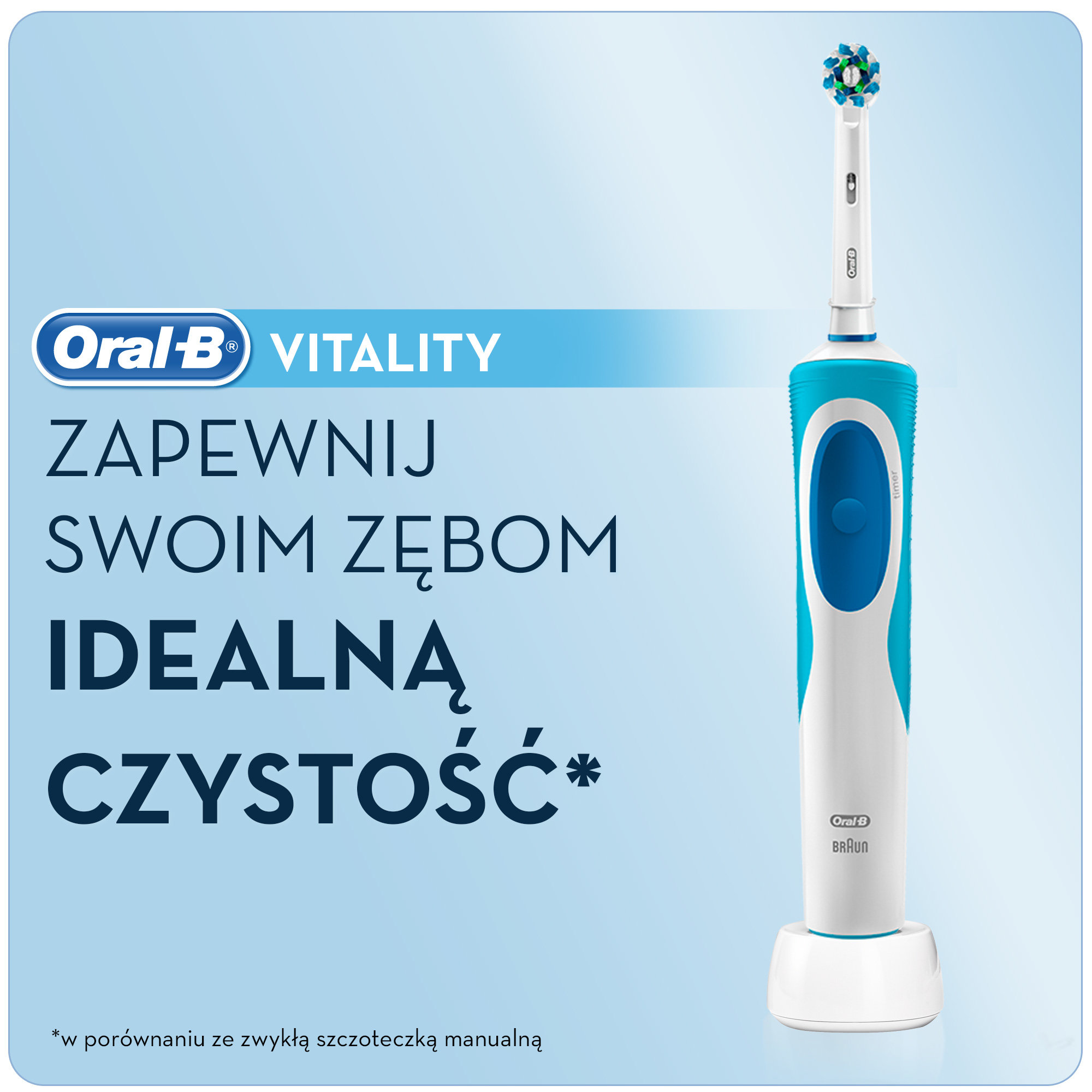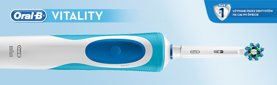 Jak dowodzą badania kliniczne, szczoteczka elektryczna Oral-B Vitality czyści zęby skuteczniej niż zwykła szczoteczka manualna. Wymienna końcówka CrossAction, o kształcie inspirowanym profesjonalnym sprzętem dentystycznym, dokładnie otacza każdy ząb, dzięki włóknom ustawionym pod kątem 16 stopni i czyści go, wykorzystując technologię 2D opartą na dwóch rodzajach ruchów: oscylacyjnych i rotacyjnych, co pozwala usunąć więcej płytki nazębnej niż w przypadku zwykłej szczoteczki manualnej. Umieszczony w rączce szczoteczki timer pomaga wypełniać wytyczne dentystów dotyczące mycia zębów przez co najmniej 2 minuty. A to wszystko opracowane zostało przez Oral-B, markę najczęściej używaną przez dentystów na świecie.