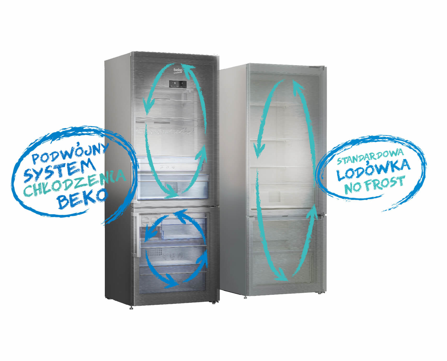 Neo Frost | Przechowuj żywność bez szronu, lodu i wysuszania Jedz swoje ulubione potrawy tak, jak najbardziej lubisz: technologia NeoFrost eliminuje powstawanie lodu na żywności oraz wewnątrz urządzenia. Dzięki temu rozmrażanie nie jest już potrzebne. Technologia NeoFrost w lodówkach Beko to następna generacja systemu Full NoFrost (Frost free) i polega na rozdzieleniu obiegów powietrza w części chłodzącej i mrożącej, co zapewnia idealne warunki do przechowywania żywności, a także eliminuje przenoszenie się zapachów. |