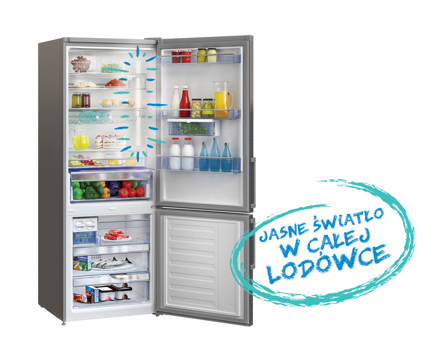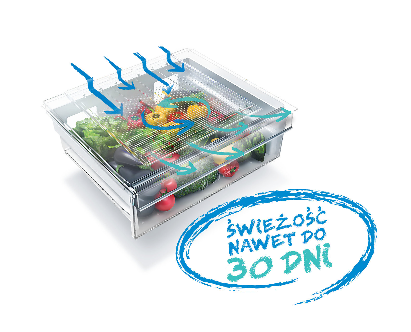 Everfresh+ Zielone warzywa często psują się w lodówce, ponieważ zazwyczaj kupuje się je w dużych ilościach. W celu przedłużenia świeżości warzyw, Beko zaprojektowało nową komorę o nazwie Everfresh+. Dzięki dokładnej regulacji wilgotności powietrza wpadającego przez specjalne kanały do jej środka, a także dzięki konstrukcji komory, świeżość zgromadzonych w niej warzyw przedłuży się nawet do 30 dni. |