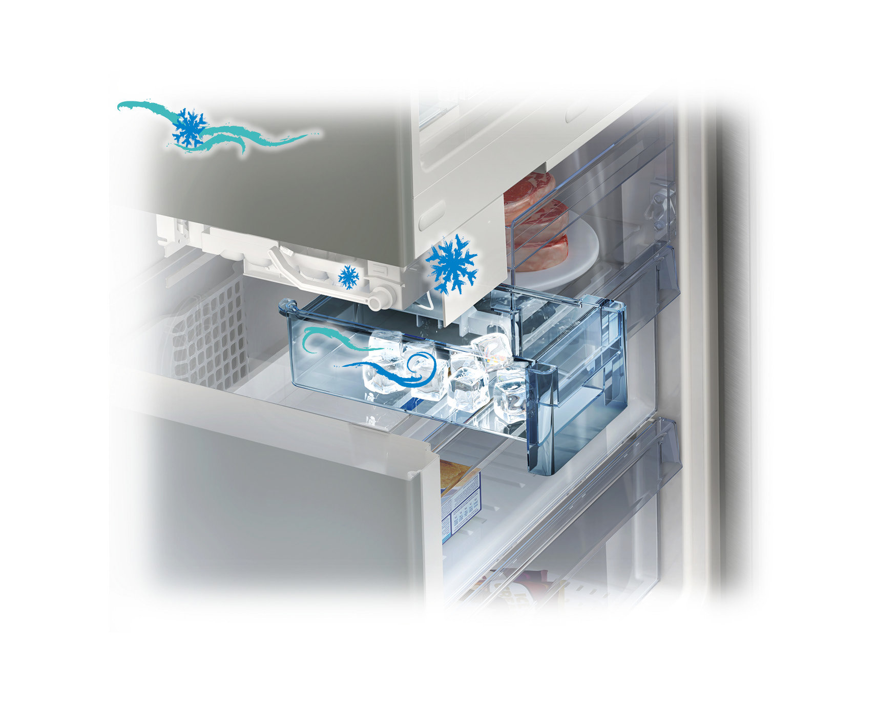 | NeoFrost Technologia NeoFrost nie tylko eliminuje powstawanie lodu na żywności oraz wewnątrz urządzenia, co oznacza, iż rozmrażanie nie jest już potrzebne. To także dwa (lub trzy - w lodówkach typu side-by-side) niezależne parowniki i wentylatory w jednym urządzeniu. |
