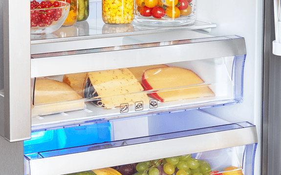 Pojemnik umieszczony na górze drzwi chłodziarki, dzięki przeźroczystym ściankom zapewnia idealne miejsce do przechowywania produktów mlecznych, chroniąc je przed wyschnięciem.