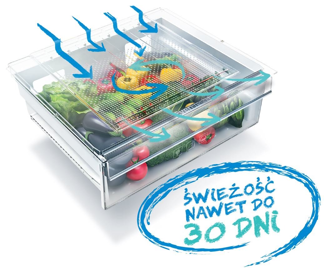 | Komora EverFresh+ | Przechowuj świeże warzywa i owoce nawet do 30 dni Zielone warzywa często psują się w lodówce, ponieważ zazwyczaj kupuje się je w dużych ilościach. W celu przedłużenia świeżości warzyw i owoców, Beko zaprojektowało nową komorę o nazwie EverFresh+. Dzięki niej warzywa i owoce znacznie dłużej zachowują świeżość i przydatność do spożycia – nawet do 30 dni. Komora EverFresh+ minimalizuje wahania temperatury wewnątrz szuflady poprzez zastosowanie uszczelki naokoło pokrywy szuflady, zaś specjalnie wytłoczona, perforowana pokrywa gwarantuje bardzo wysoki poziom wilgoci- optymalny dla warzyw i owoców. |