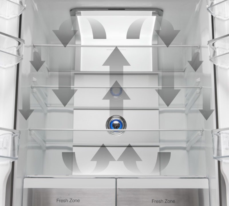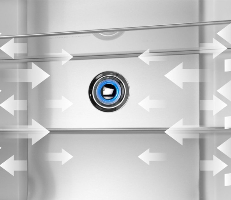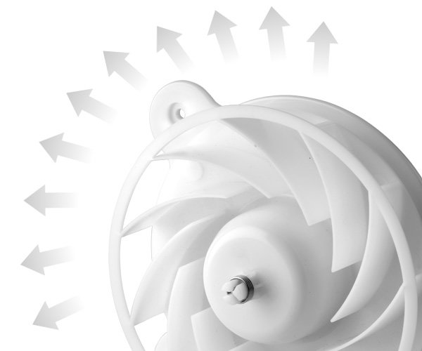 Wentylator odśrodkowy Ma specjalnie przystosowane ostrza, które rozprowadzają powietrze wewnątrz lodówki na boki, w przeciwieństwie do konwencjonalnego wentylatora. Powoduje to obniżenie poziomu hałasu. |