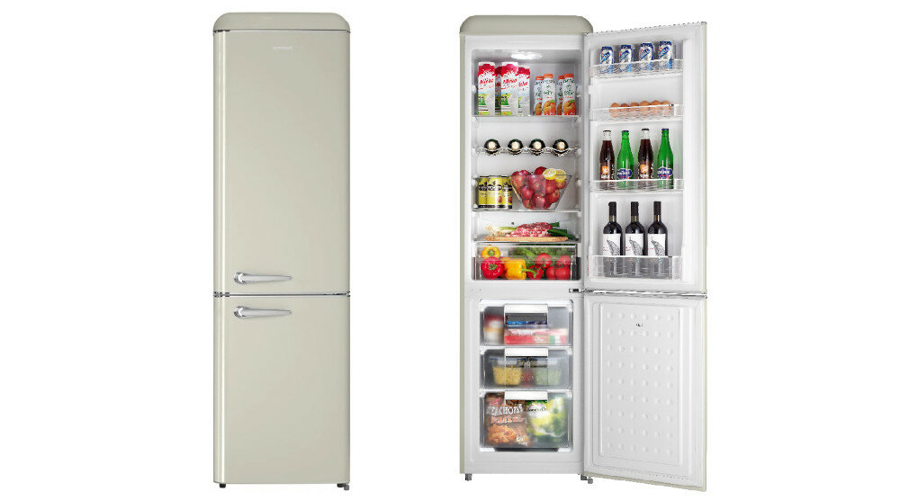Dzięki niewielkim wymiarom zmieści się niemal w każdym miejscu, dodatkowo oferuje pojemność 250 l. We wnętrzu znajdują się szklane półki, półka na wino oraz pojemna szuflada na owoce i warzywa. Drzwi lodówki wyposażone są w 4 półki do przechowywania drobnych produktów. Zamrażarka o pojemności 64 l znajduje się w górnej części urządzenia.