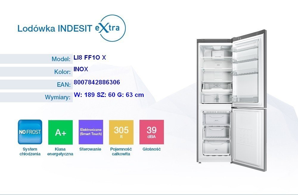Lodówkę kupiłem z myslą o nowym mieszkaniu. Potrzebowałem sprzętu energooszczędnego, z funkcją "no frost". W INDESIT LI8 FF1O X oba wymogi są spełnione, a dodatkowo mamy tu nowoczesną stylistykę i połączenie srebra oraz czerni, dopasowane do stylistyki kuchni. Komora świeżości dla mięsa i wędlin oraz pojemnik na warzywa są dopasowane wielkością do potrzeb rodziny. Miejsce do przechowywania w drzwiczkach pomieści butelki i kartony o różnej wielkości. Szuflady zamrażarki mają czytelne oznaczenie, a praca urządzenia jest zadowalająco cicha.Dzięki promocji kupiłem lodówkę niemal trzysta złotych taniej, więc zdecydowanie polecam ze względu na parametry, wzornictwo i cenę.
