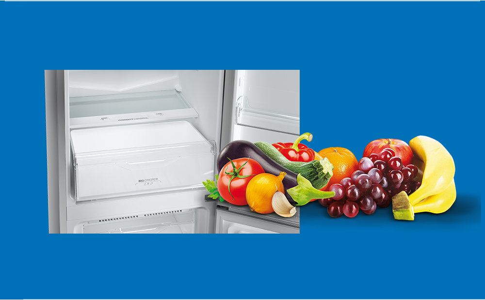 Warzywa i owoce w jednym, większym koszu, który zapewnia naturalny poziom wilgotności.Dzięki temu pozostają świeże na dłużej.