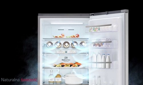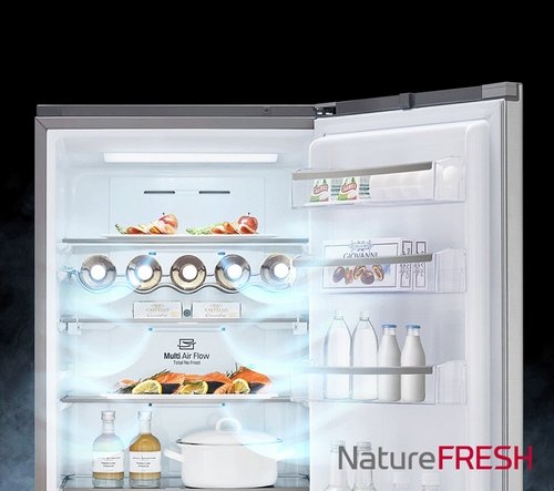 System NatureFRESH Cooling firmy LG zapewnia obieg chłodnego powietrza przez kilka otworów wentylacyjnych, co skutkuje bardziej równomiernym chłodzeniem wnętrza lodówki. Obieg zimnego powietrza lepszy nawet o 76% niż w przypadku półautomatycznych systemów odmrażających.