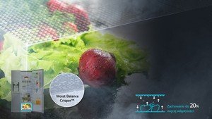 Moist Balance Crisper™ Nadmiar wilgoci paruje z żywności i skrapla się na kratce, zamiast gromadzić się wokół jedzenia — w ten sposób w pojemniku utrzymywany jest odpowiedni poziom wilgotności. |