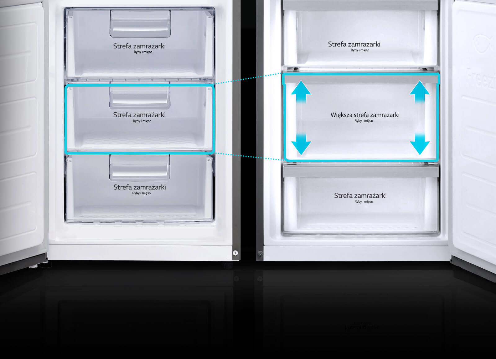Powiększona strefa zamrażarki Firma LG powiększyła jedną z szuflad zamrażarki, aby zapewnić więcej miejsca na przechowywanie dużych produktów. |