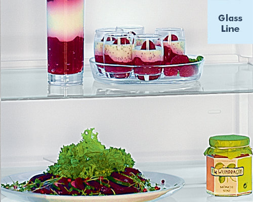 Stylowe wyposażenie GlassLine, to połączenie perfekcyjnego wykonania z atrakcyjnym designem. Eleganckie, szklane półki z hartowanego szkła są łatwe do mycia oraz posiadają wysoką wytrzymałość na obciążenia. Zarówno szklana dzielona półka, wsuwana jedna pod drugą, jak i pozostałe półki mogą zostać umieszczone na dowolnej wysokości wnętrza urządzenia.