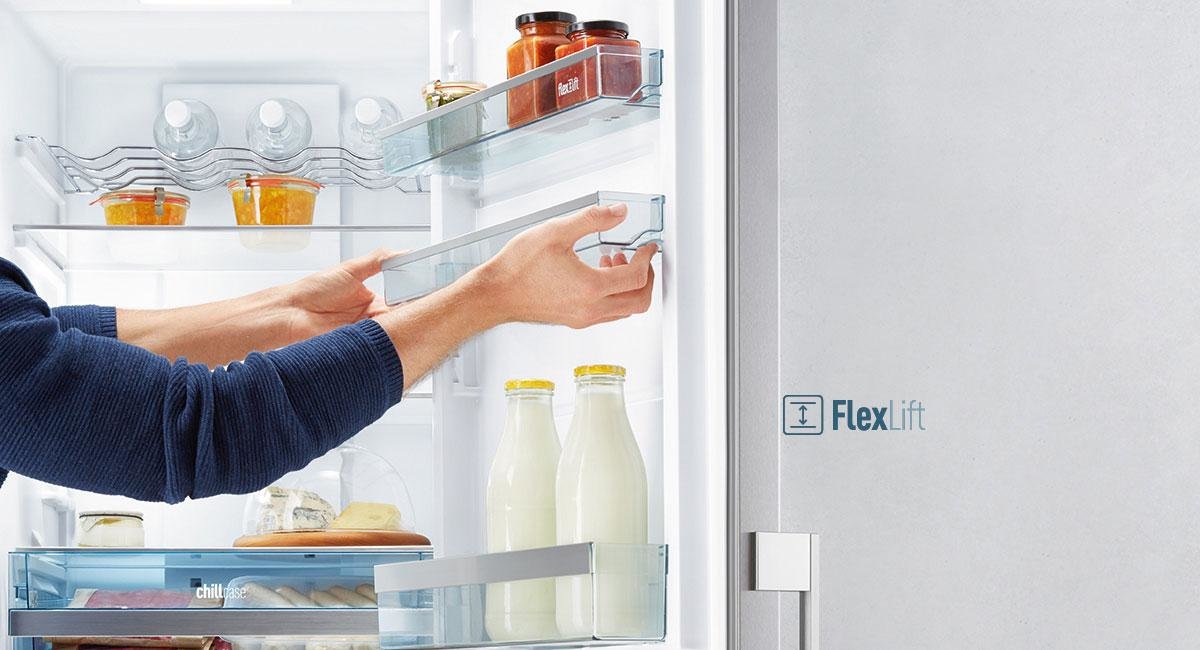Rozwiązanie FlexLift pozwala łatwo zoptymalizować wykorzystanie miejsca w lodówce.Górne kieszenie na drzwiach można szybko i łatwo dostosować, by mieściły większe butelki i pojemniki o wadze do 5 kg, co zapewnia szybki i łatwy dostęp do wszystkich produktów, bez względu na ich kształt.