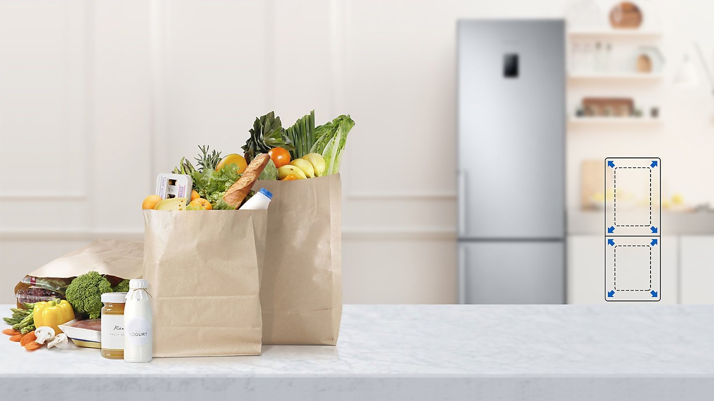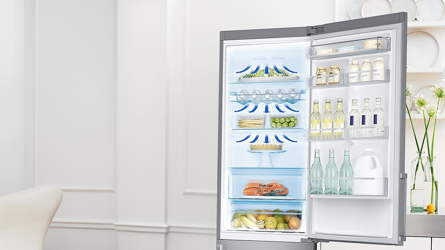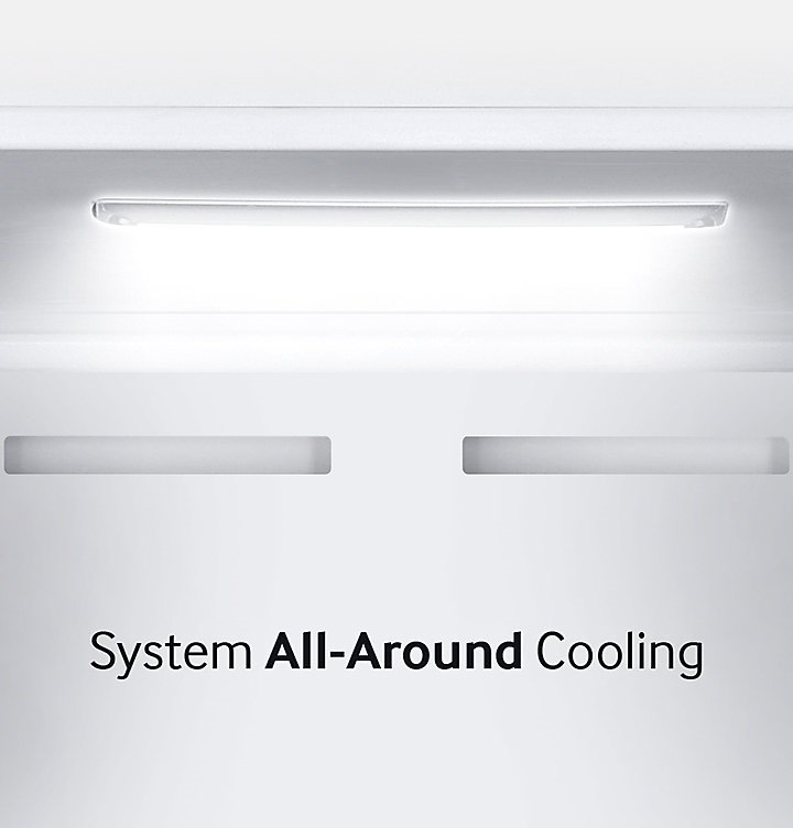 | System All-Around Cooling Zapewnia dotarcie chłodnego powietrza do każdego zakamarka lodówki. Zimne powietrze jest wydmuchiwane przez liczne otwory znajdujące się na poziomie każdej półki, dzięki czemu w lodówce panuje stała temperatura, a żywność pozostaje świeża. |