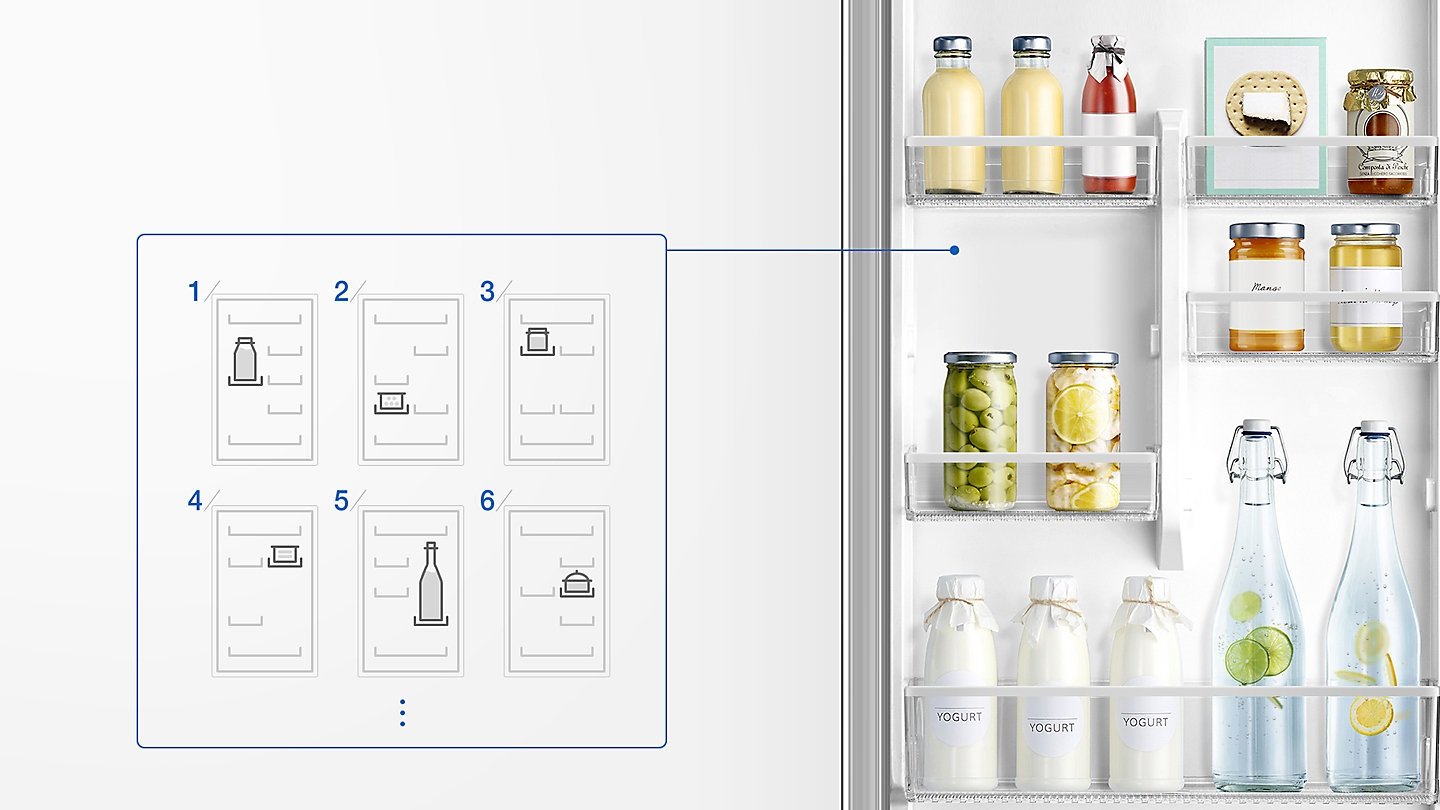 | Dowolny sposób przechowywania 4 demontowalne półki na drzwiach lodówki ułatwiają organizację przechowywania produktów o różnych rozmiarach. Półki mogą być ustawiane w taki sposób, aby umożliwić przechowywanie butelek, kartonów i innych produktów różnej wielkości. |