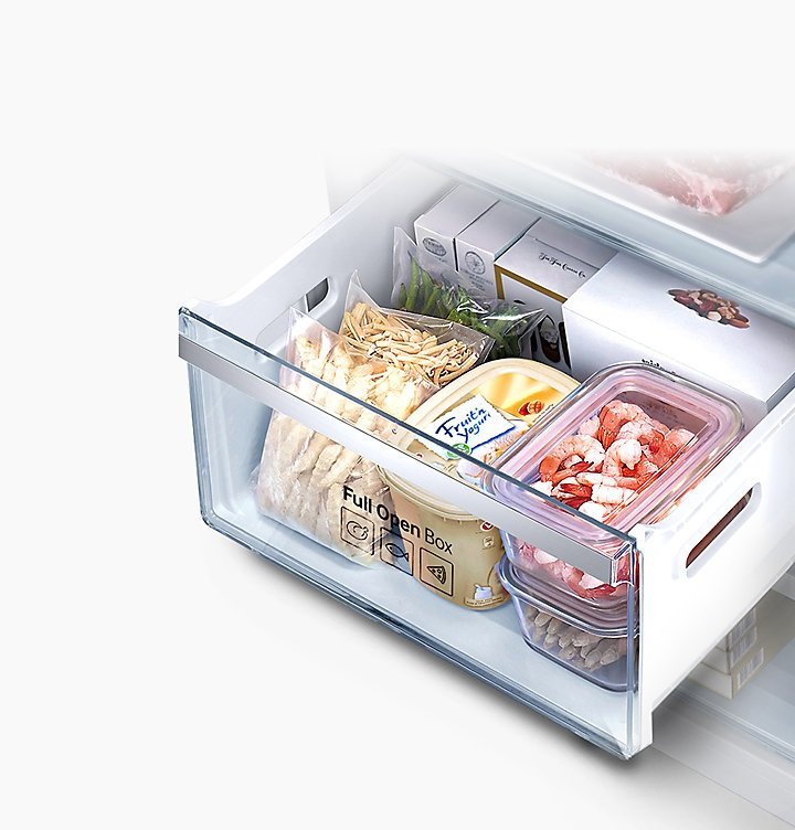 Szuflada z pełnym wysuwem (zamrażalnik) Większy wysuw ułatwia organizowanie i wyjmowanie produktów przy jednoczesnej optymalizacji przestrzeni. |