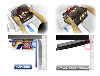 Szuflada z pełnym wysuwem zapewnia lepszy dostęp i ułatwia porządkowanie i wyjmowanie produktów z zamrażarki – nawet tych większych, jak rodzinne pudełko lodów. Szuflada wysuwa się całkowicie, zapewniając optymalne wykorzystanie przestrzeni i, dzięki jej specjalnemu kształtowi można ją wysunąć, nawet jeśli drzwi zamrażarki otwarte są pod kątem zaledwie 90 stopni.