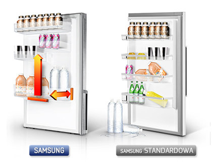Wygodna, duża półka na drzwiach jest głębsza niż w standardowych lodówkach – w sam raz dla spragnionych. Możesz przechowywać na drzwiach lodówki duże pojemniki mleka i soku, a do tego zmieszczą się tam dwa rzędy puszek i butelek z napojami. Urządzasz przyjęcie? Na dużej półce z powodzeniem schłodzisz wysokie butelki z wodą i innymi napojami.