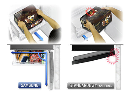 Szuflada z pełnym wysuwem zapewnia lepszy dostęp i ułatwia porządkowanie i wyjmowanie produktów z zamrażarki – nawet tych większych, jak rodzinne pudełko lodów. Szuflada wysuwa się całkowicie, zapewniając optymalne wykorzystanie przestrzeni i, dzięki jej specjalnemu kształtowi można ją wysunąć, nawet jeśli drzwi zamrażarki otwarte są pod kątem zaledwie 90 stopni.