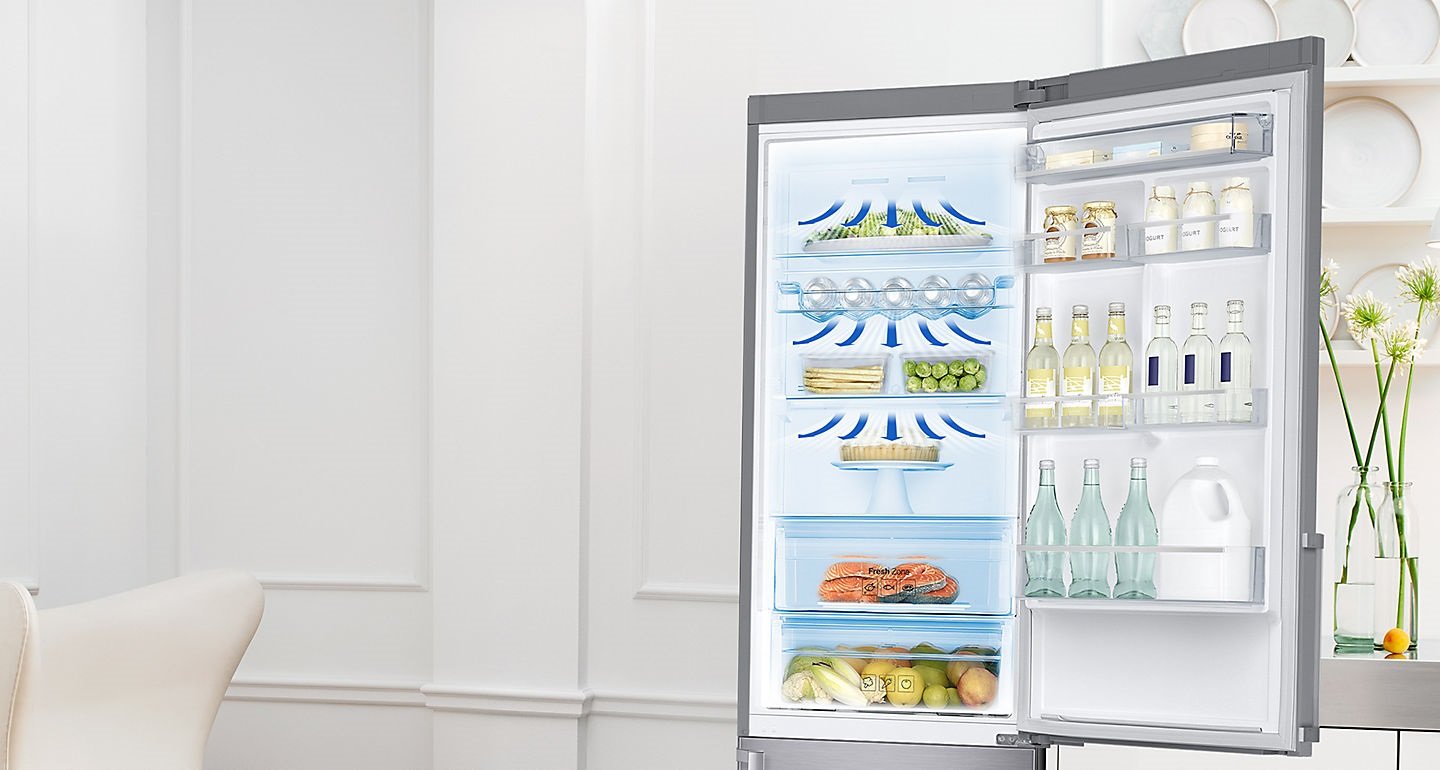 | System All-Around Cooling Zapewnia dotarcie chłodnego powietrza do każdego zakamarka lodówki. Zimne powietrze jest wydmuchiwane przez liczne otwory znajdujące się na poziomie każdej półki, dzięki czemu w urządzeniu panuje stała temperatura, a żywność pozostaje świeża. |