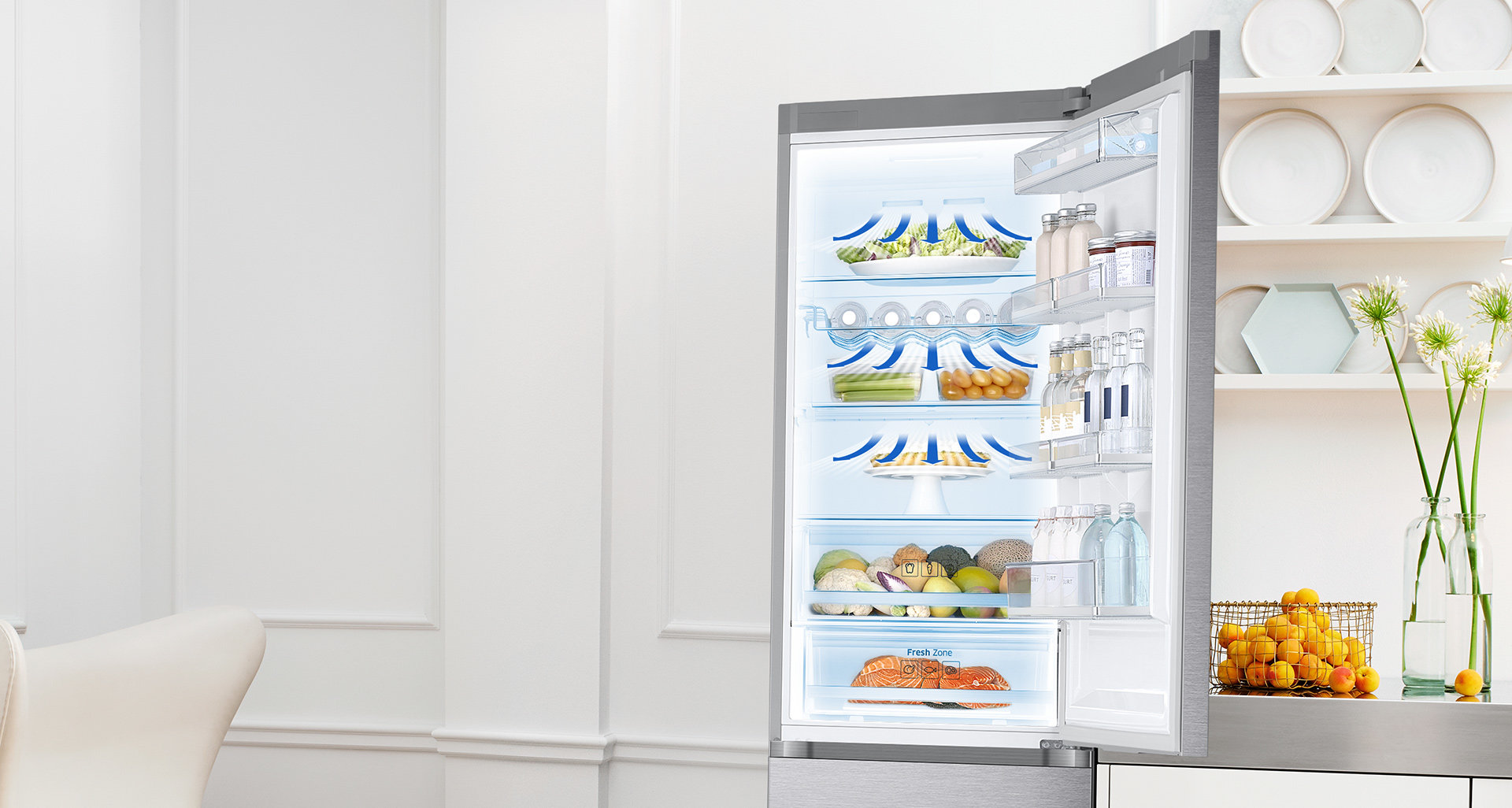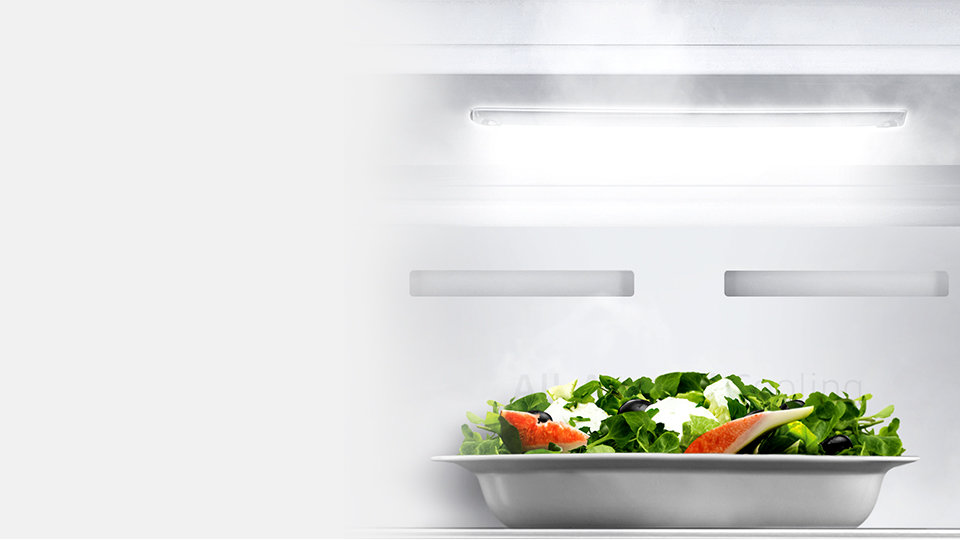 | System All-Around Cooling System All-Around Cooling zapewnia dotarcie chłodnego powietrza do każdego zakamarka lodówki. Zimne powietrze jest wydmuchiwane przez liczne otwory znajdujące się na poziomie każdej półki, dzięki czemu w lodówce panuje stała temperatura, a żywność pozostaje świeża. |