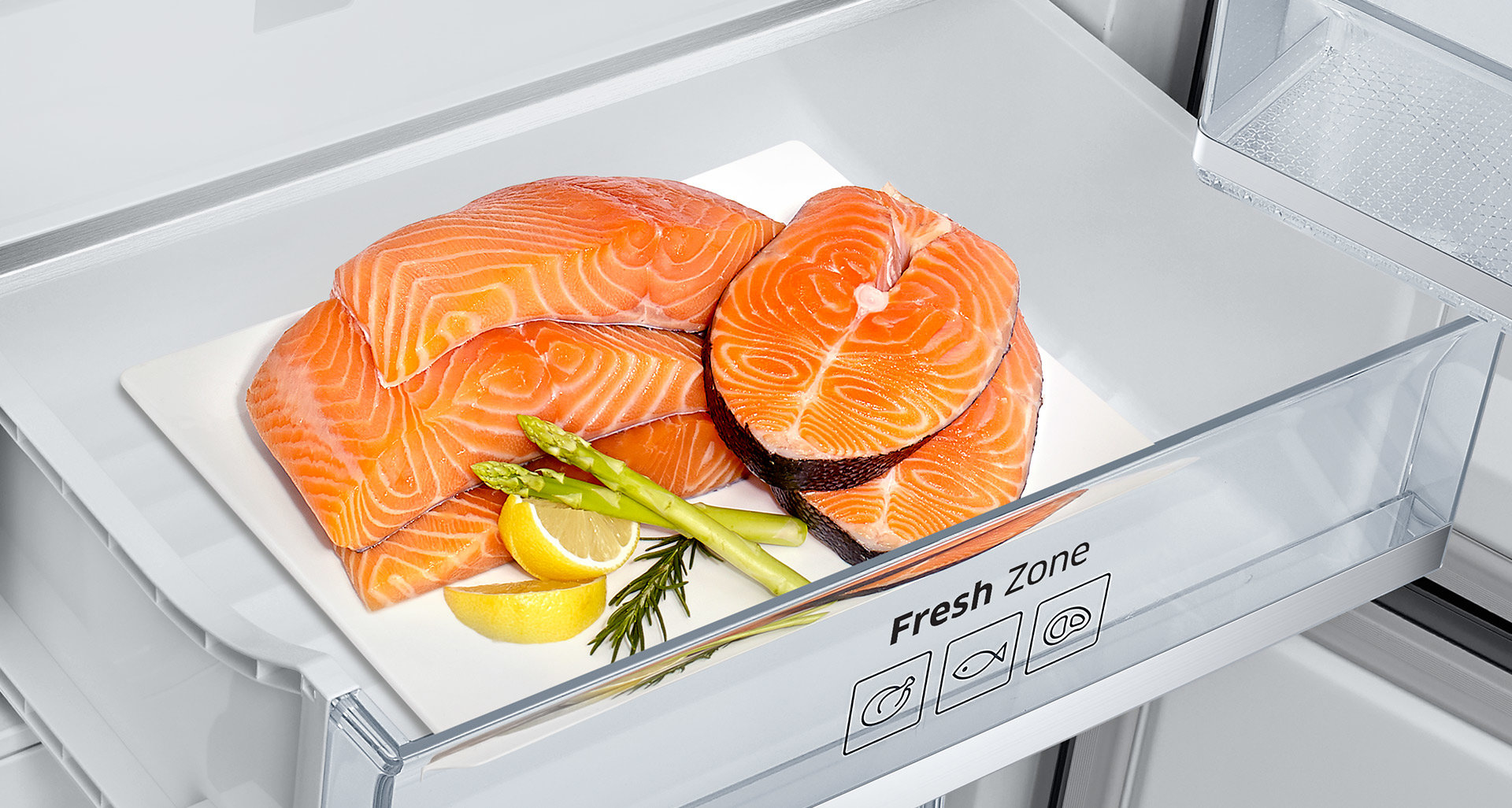 Idealne warunki do przechowywania mięsa i ryb Fresh Zone to pomysłowa szuflada, która zapewnia idealne warunki do przechowywania mięsa i ryb z optymalną temperaturą stanowiącą gwarancję utrzymania świeżości i smaku produktów. |