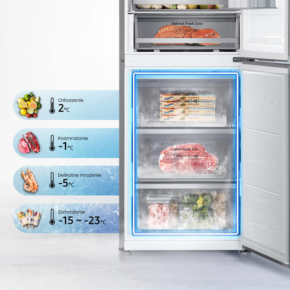 Chłódź lub zamrażaj produkty, w zależności od tego, co potrzebujesz aktualnie przechowywać. W dolnej części urządzenia możesz ustawić jedną z czterech różnych temperatur: -23~-15/-5/-1/2°C.