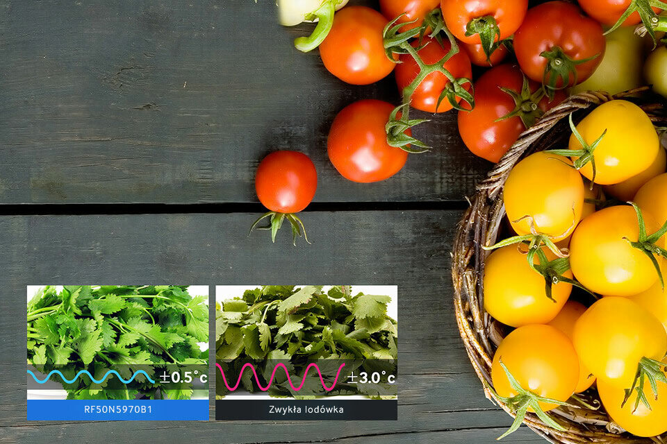 Technologia eliminuje tworzenie się szronu i lodu wewnątrz lodówki. Warzywa, wędliny i sery dłużej pozostają świeże.